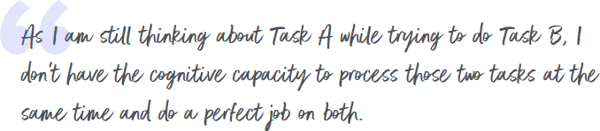 There’s a cost to all of these interruptions. Researcher Sophie Leroy from the University of Washington tells Harvard Business Review (HBR) what happens: